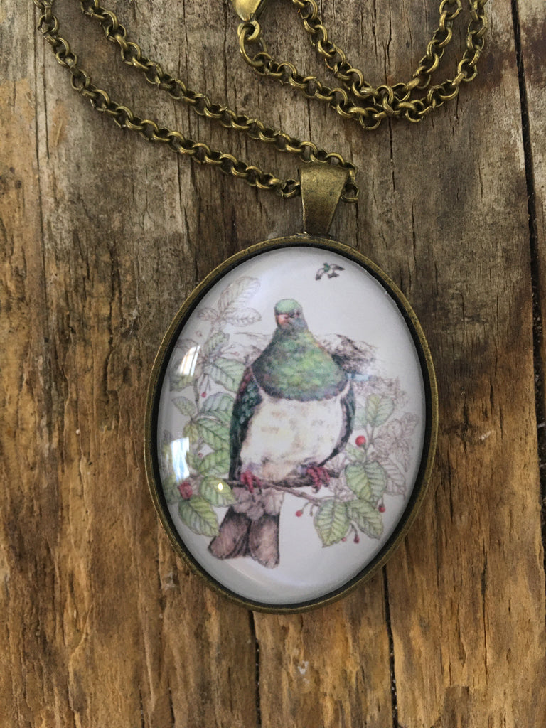 New Zealand native pigeon commonly known as the Wood Pigeon or Kereru, bezel pendant 30x40mm with glass cabochon dome necklace with 24" Rolo chain.